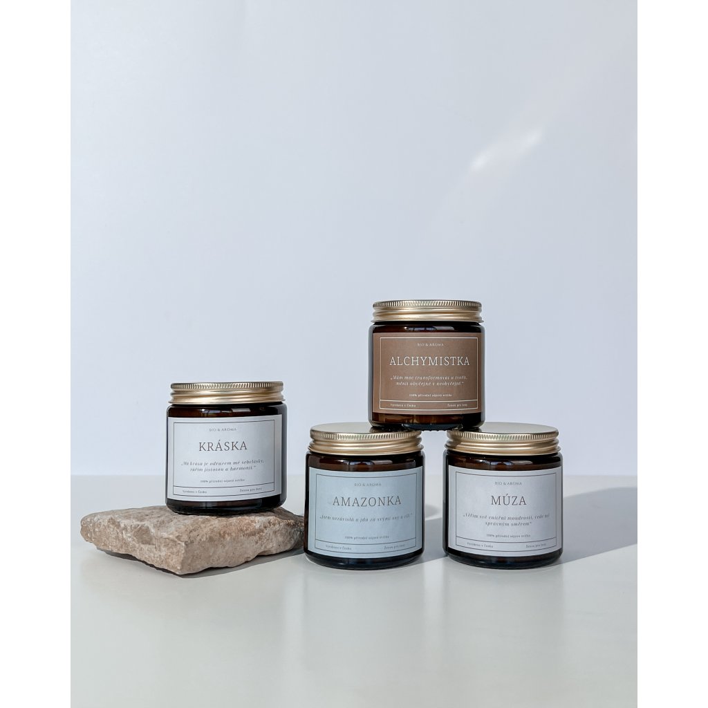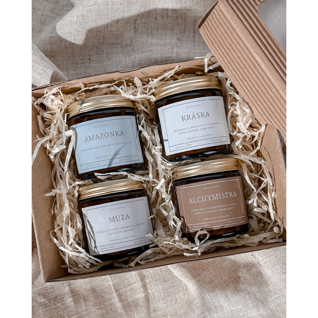 Najdete v ní čtyři jedinečné sójové svíčky inspirované ženskými kvalitami: Kráska, Múza, Amazonka a Alchymistka. Každá z nich nese specifickou vůni z čistých esenciálních olejů, afirmaci a atmosféru – pro chvíle klidu, tvořivosti, síly i vnitřní proměny.