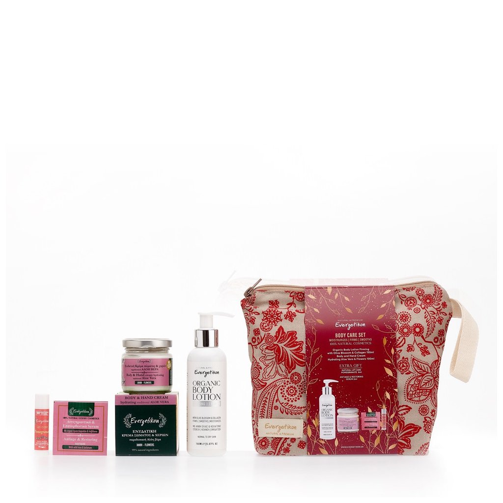 V tomto dárkovém setu 100% přírodní péče o tělo najdete: Organické tělové mléko s kolagenem a olivovým květem 150 ml, Hydratační krém na tělo a ruce s tradičními květy a Aloe Vera 100 ml, Balzám na rty v tyčince Granátové jablíčko 5 ml, + vzoreček 2 ml Anti-aging obnovující pleťové sérum proti vráskám s divokou růží