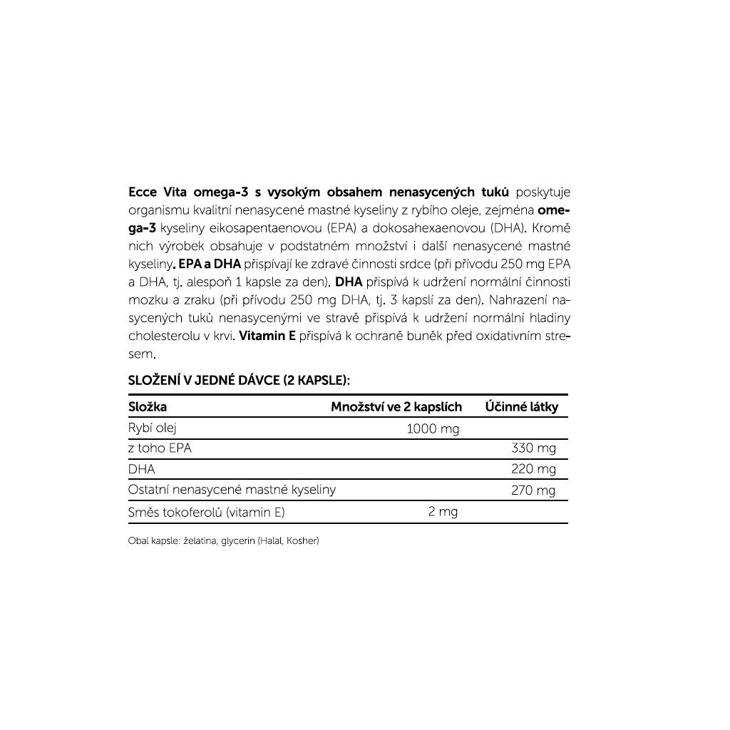 Obsah látek v jedné kapsli (505 mg): EPA 165 mg, DHA 110 mg, jiné omega 50 mg, vitamin E 5 mg, rybí olej 175 mg