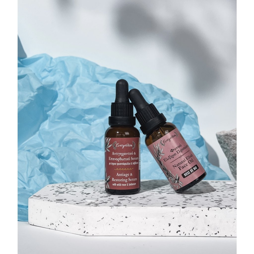 Ingredients: Simmondsia chinensis Seed Oil (Jojoba), Vitis Vinifera (Grape) Seed Grapasede seed oil, Europaea (Olive) Fruit Oil “Cretan” extra virgin olive oil, Oenothera Biennis (Evening Primrose), Rosmarinus Officinalis (Rosemary) Leaf Extract, Tocopherol Acetate (vitamin E), Pelargonium Graveolens Oil (Geranium Oil), Rose damascena flower extract (rose concrete).