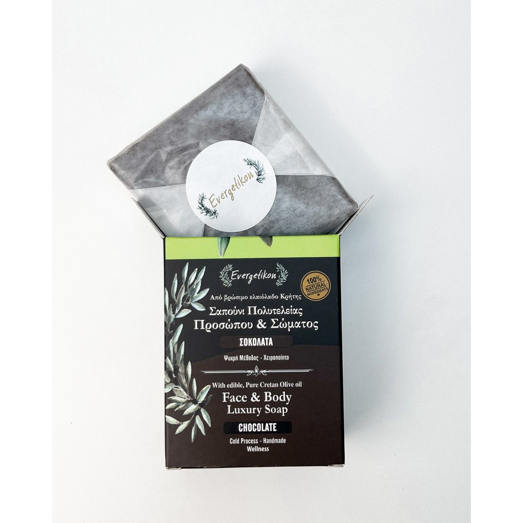 INCI: Olea Europaea (Olive) Fruit Oil Cretan extra virgin olive oil, Cocos Nucifera (Coconut) Oil, Aqua, Sodium Hydroxide, Prunus Amygdalus Dulcis (Sweet Almond) Oil, calendula officinalis flowers extract, Aloe barbadensls leaf Juice, Flavor Chocolate, Cocoa powder.