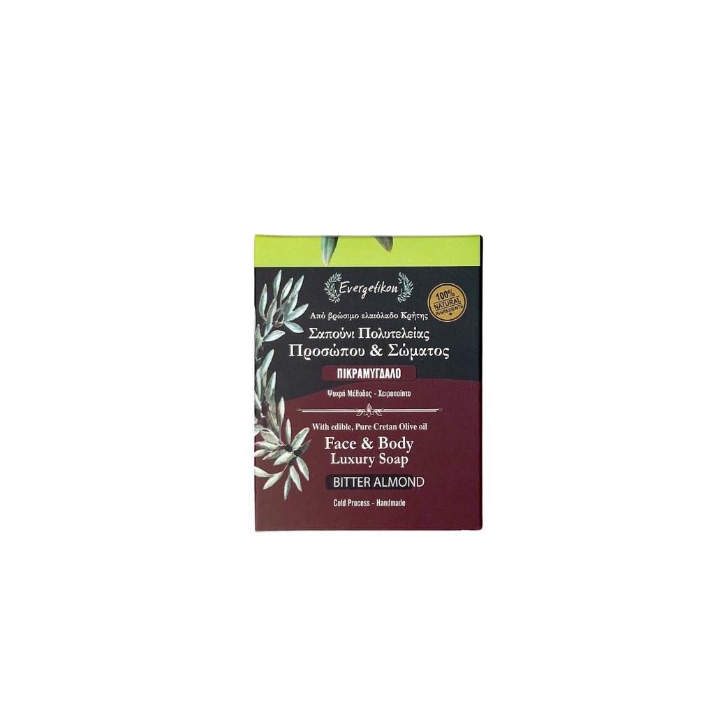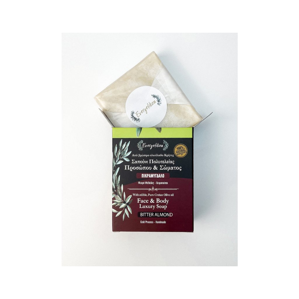 Mýdlo obsahuje extra panenský olej z olivových hájů Evergetikon, kokosový olej, mandlový olej, aloe vera, bylinné extrakty, výtažek z měsíčku a hořkou mandli.