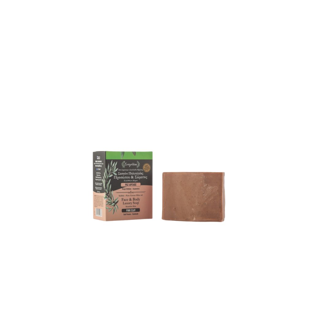 Mýdlo obsahuje extra panenský olej z olivových hájů Evergetikon, kokosový olej, mandlový olej, aloe vera, bylinné extrakty, výtažek z měsíčku a růžový jíl.