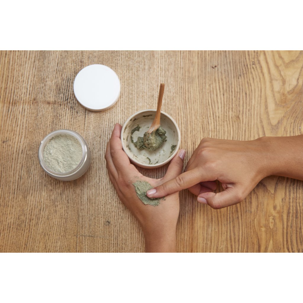1–2× týdně, na čistou a suchou pleť, smíchejte dvě lžičky prášku s malým množstvím vody, dokud nevznikne krémová pasta. Naneste rovnoměrně na obličej, vynechte oční okolí.